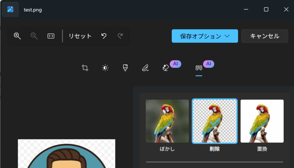 2. 編集アイコン → 背景に対する「AI」アイコン → 「削除」