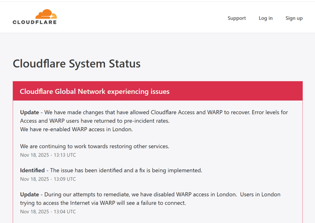 以下は、Cloudflareの障害状況を報告するスクリーンショットです。